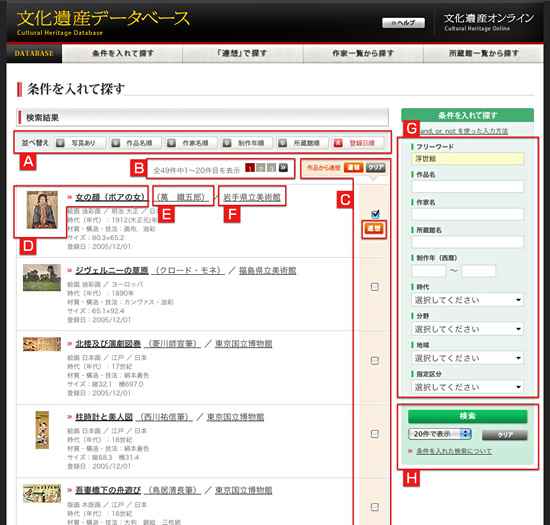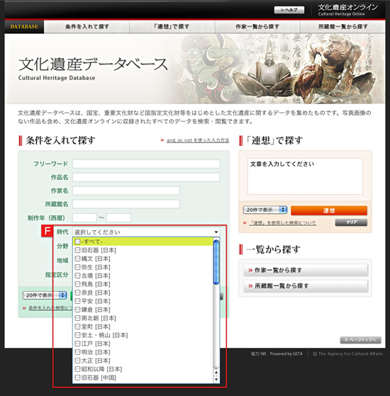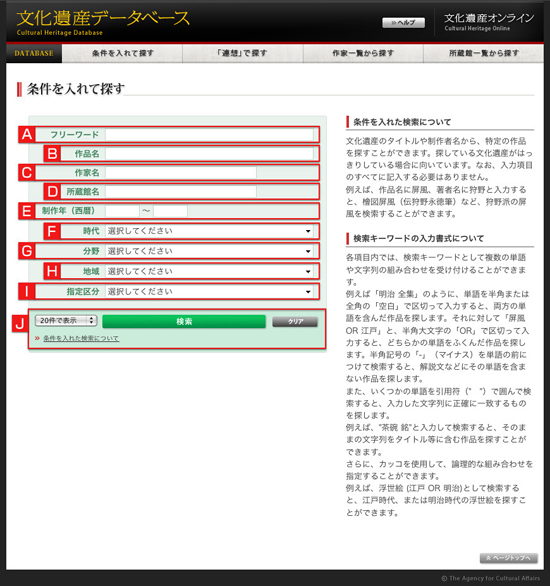 文化遺産のタイトルや制作者名から特定の作品を探すことができます。探している文化遺産がはっきりしている場合にこの方法が適しています。なお、入力項目のすべてに記入する必要はありません。