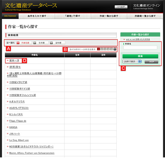入力欄に作家名を入れることで、作家を絞り込むことができます。