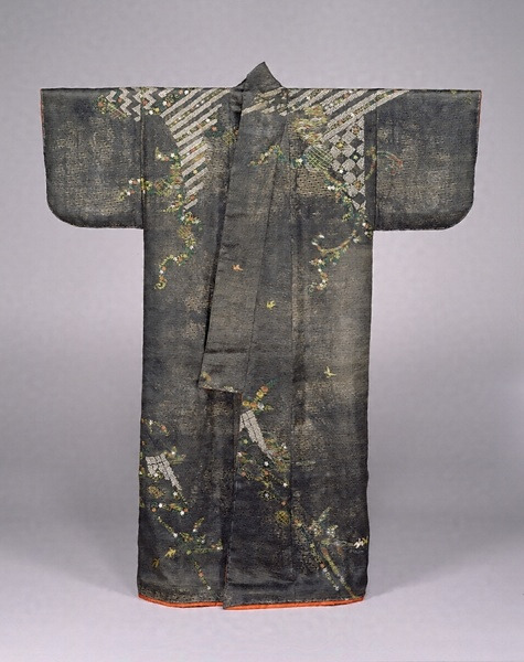 黒紅地花卉文様繍箔小袖