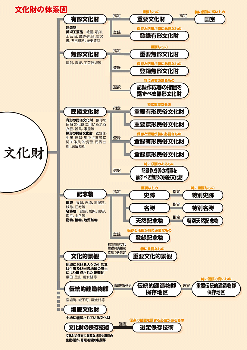 文化財保護法では、文化財を「有形文化財」、「無形文化財」、「民俗文化財」、「記念物」、「文化的景観」及び「伝統的建造物群」と定義し、これらの文化財のうち、重要なものを国が指定・選定・登録し、重点的に保護しています。