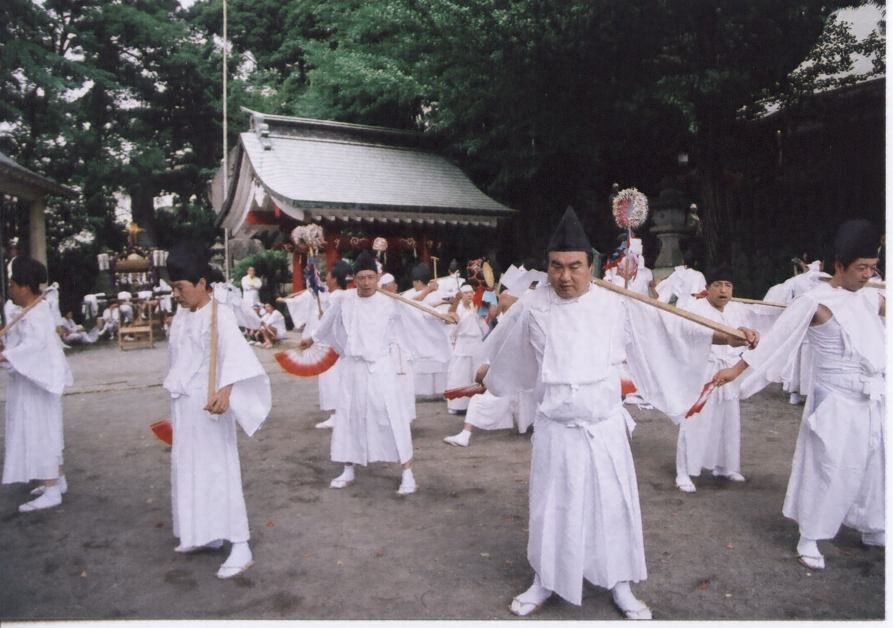 この芸能は、神奈川県足柄下郡湯河原町吉浜の素鵞神社の祭礼(八月二日)に行なわれる芸能で、白丁姿で右手に扇、左手に幣束を持った踊り手の中に、太鼓役一人、鉦役二人、黄金柄杓・日月・たたら棒を持った役の者がさらに加わる。これに裃をつけ、青竹を手にした警固の役がつく。