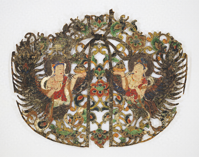 華鬘は仏殿内陣の長押(なげし)などに懸けられた荘厳具(しょうごんぐ)で、起源は古代インドにおいて貴人に捧げられた生花で作られたレイのような花輪であると言われる。本品は京都・東寺旧蔵の牛皮(ごひ)製、団扇形の華鬘で、現在本品を含め13枚と残片が当館に所蔵されている。寺伝では応徳3年(1086)の塔供養の荘厳に用いられた具と伝えるが、この一群の華鬘は当初から一具をなしたものではなく、寺内の各堂から集められた感が強い。いずれも牛皮を透彫し、表裏に彩色をほどこしている。大別して宝相華(ほうぞうげ)唐草迦陵頻伽対向文と宝相華唐草文の二系統が見られる。登号は宝相華を背景に総角(あげまき)をはさんで向かい合う2羽の迦陵頻伽(かりょうびんが)(極楽にいる半人半鳥の瑞鳥)を表しており、鮮やかな彩色と精緻な截金や金銀切箔(きりはく)の手法を用いている。呂号は宝相華唐草文を暈繝彩色(濃淡や色調の違う色を隣り合わせて立体感やぼかしの効果を生む技法)で表す。双方とも地板の一部と覆輪を欠く。団扇形の牛皮華鬘の遺例としては最古の品。