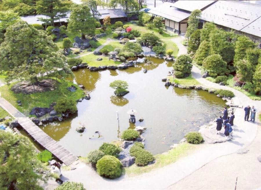 庭園は、石で護岸された複雑な汀線から成る池を中心として、敷地の東端に茶室である揚亀庵を配置し、西端になだらかな築山を造成している。揚亀庵の縁先に立つと、池の水面を前景として、その背後に控える築山の樹間から、弘前城跡の樹叢をはじめ遥かに岩木山の秀麗な山容を遠望することができる。縁先の沓脱石からは、池の東岸に据えられた「礼拝石」と呼ぶ大きな景石に向かって飛石が間隔広く打たれ、広々とした水面の中央に浮かぶ中島と、対岸に当たる築山の左右奥部に渓谷を模して設けられた枯流れ及び枯滝石組を望むことができる。池を一周する園路の途上からは、2ヶ所に架けられた木橋のほか、雪見燈籠などの石燈籠、枯流れの奥に設けられた枯滝石組、庭園の主木を成す傘形のクロマツなど、小さな敷地の随所に配置された勝景を楽しむことができる。また、揚亀庵の南側のやや離れた位置には富士山形の手水鉢を備えた「離れ蹲踞」があり、北側には「二神石」と呼ぶ石組を設けるなど、大石武学流庭園に特有の作風が見られる。