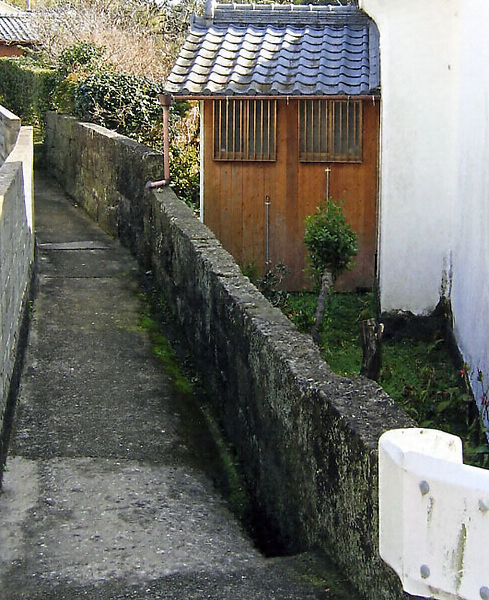門は屋敷地の北側西端に位置し、門の両側から石垣が周囲に巡る。門は間口3.1mで、方柱の門柱を建てる。石垣は2段から5段に切石を積み、高さ0.7mから1.4mで、総延長77mに及ぶ。石垣に接して生垣が植えられるなど、歴史的景観をつくる。