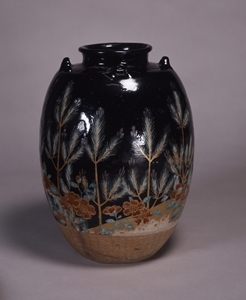 肩衝形茶入を拡大して肩の四方に耳をつけたかのような,独特の形式を有する茶壺である。胴には,山を遠景に配して若松,桜,椿などの図をあらわし,図柄以外の地には黒釉をかけている。漆黒の地に色あざやかな図様がよく映え,吉祥図案としても他にみない構図をとる。また,平らな底の左側中央には「仁清」の大印が捺されている。かつて仁清の茶壺をいくつも蔵していた丸亀藩京極家に伝来した優品である。