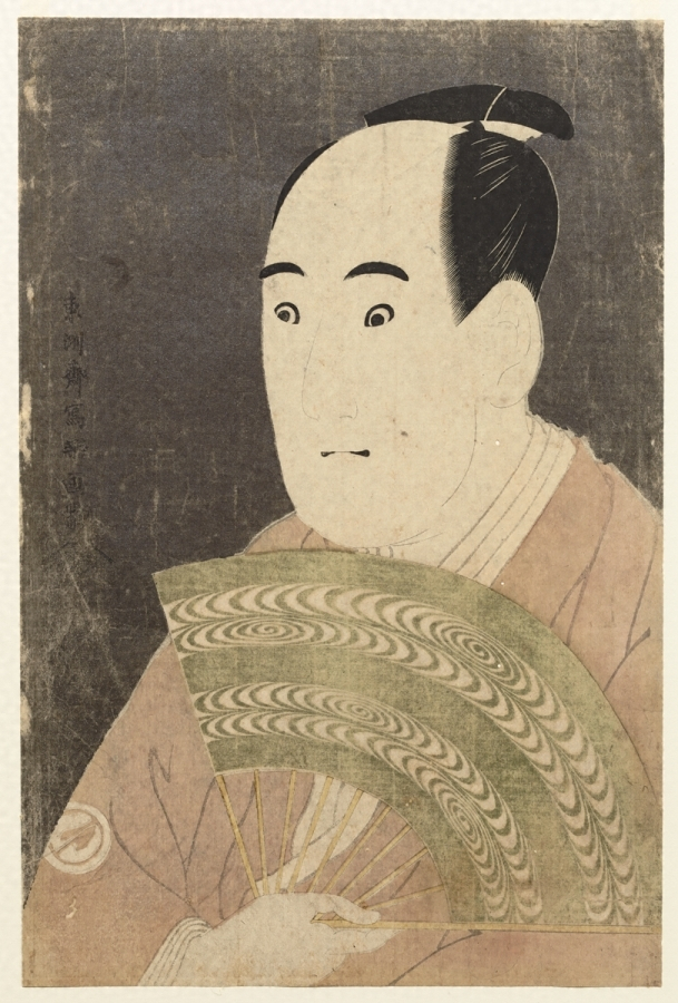寛政六年(1794)五月に江戸で興行した三座(都座,桐座,河原崎座)の歌舞伎役者の似顔絵のうちの一枚である。女を演じる役者の男性としての風貌を鋭くとらえている。背景は黒雲母摺という豪華な技法を用いている。