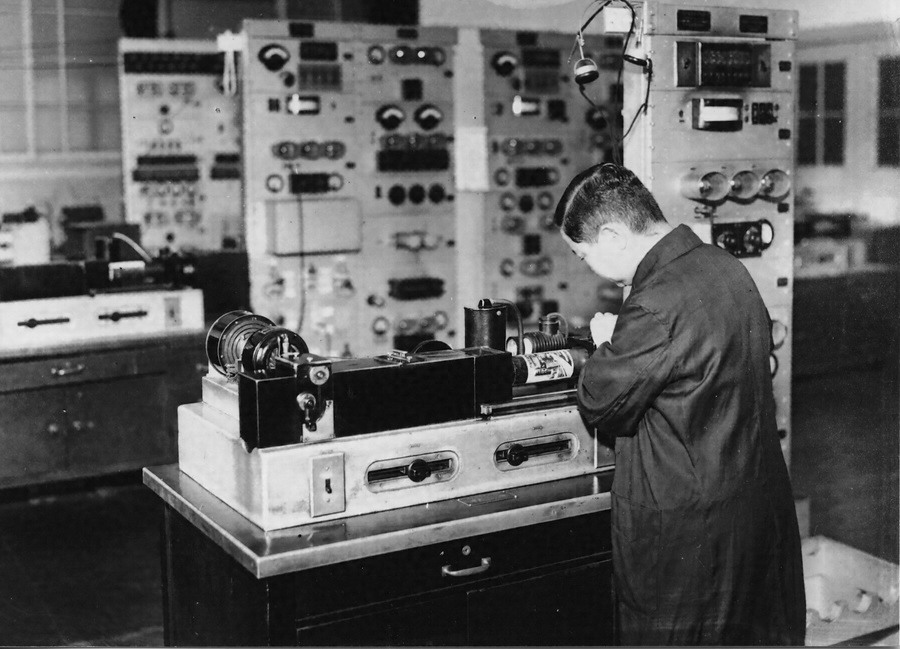 東京中央電信局防毒マスクを使用して通信機操作