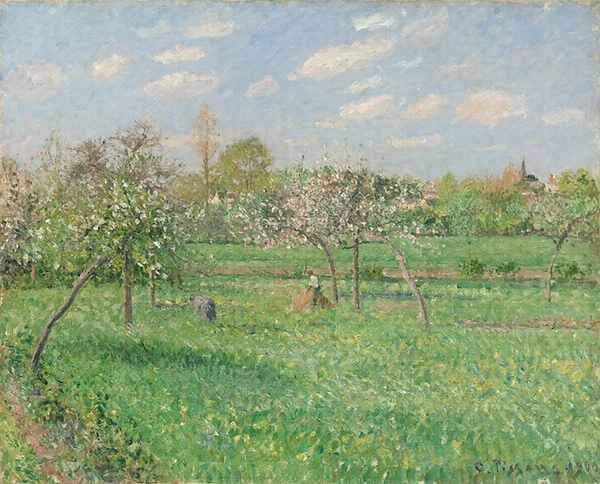 晩年のピサロの制作拠点となったのは、1884年から移り住んでいたエラニー=シュル=エプトの家で、彼は林檎の果樹園に続く庭の納屋を改造したアトリエで、1903年の死の年まで制作を続けた。エラニーはパリの北西郊外約70kmのところに位置し、傍を流れるエプト川を下流に約30kmほど下ると、モネが1883年以来住んで睡蓮を描いていたジヴェルニーがある。 ピサロはエラニーの家を生活の中心に据えながらも、都会のパリにもたびたび足を運び、田園の生活と都市の生活を描き分けた。この頃の彼は、デュラン=リュエル画廊との専属契約によって定期的な個展の開催が約束されていたし、また年齢の上でも、経済的な面でも、そして技術の点においても、安定した環境と要因に恵まれていたといえる。 1900年のピサロは、前年から引き続き4月までパリで制作をして、春から初夏にかけての5~6月にエラニーの自宅に戻って制作。夏の7~9月にはノルマンディー海岸の避暑地ベルヌヴァルを訪れ、秋の10~11月に再びエラニーに戻っている。 この年、エラニーで描かれた風景は春の絵が5点、秋の絵が4点あるが、この中の春と秋の1点ずつが東京富士美術館に所蔵されている。 前述のように、本作が描かれた1900年の春(5~6月)は、エラニーの果樹園のアトリエで萌え出ずる春盛りの田園風景の制作にいそしんだ。ピサロは5月7日付の手紙の中で、エラニーの樹木の開花についての情熱的な心情を吐露している。この絵でピサロはエラニーの花咲く桃源郷を爽やかに屈託なく表現した。春のいくぶん湿気を含んだ新緑の鮮やかさや満開の林檎の花のほのぼのとした美しさを、春特有の花曇りの日差しの中に捉えようとしたのであろう。このようにピサロは、移り変わる自然の一瞬のヴィジョンをカンヴァスの上に連作として描きとどめた。同じ頃モネが、光によって変幻する色彩それ自体の変化に興味の主たる対象があったのに対して、ピサロは同じ場所のなかで視点を移動し、変化させることによって風景をさまざまな角度から切り取り、春夏秋冬の四季の変化、朝、昼、夕の一日の変化、晴れ、曇り、雨、雪の気象の変化を自在にあやつりながら、そのヴァラエティーを楽しんだのだった。
