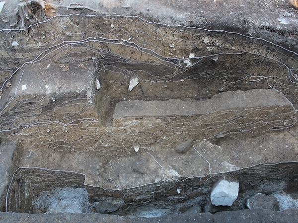 そのくぼみは直経3m、深さ3mほどで、それら竪坑が幾重にも重なっており、黒曜石の原石を採掘した跡である。周囲には土手状に多くの小型原石や剥片を交える排土が積まれ、くぼみも排土で半ば埋まっている。