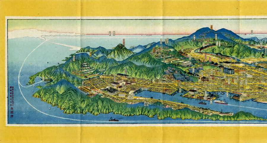 昭和10(1935)年、県下で四番目に市制を施行した。裏面には、「商工ノ都ト讃ヘラレ伊予ノ大阪ト謳ハレテ井ル」と記載されている。同14年、予讃線平野〜八幡浜間が開通した。