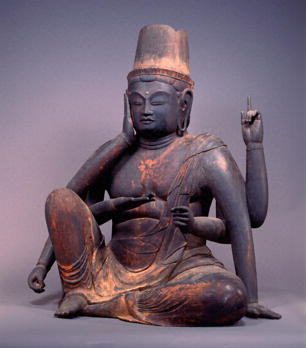 江戸時代に丹後国の海中より発見されたという伝承をもち、その後、京都市内の回向院(えこういん)に伝来したという。大ぶりの筒型宝冠や眉の連なった厳(いか)めしい表情、奥行きの深い頭部や体軀(たいく)の造形など、平安時代前半期にさかのぼる造像であることを物語る。頭部を真っ直ぐに立てる姿勢も、六臂如意輪観音像(ろっぴにょいりんかんのんぞう)の日本における最古作である大阪・観心寺像に通ずる。条帛(じょうはく)が腹部を幅広く覆い、背面では地付(じつき)にまで達する表現は珍しいが、天台系と考えられる作例に類例が認められる。