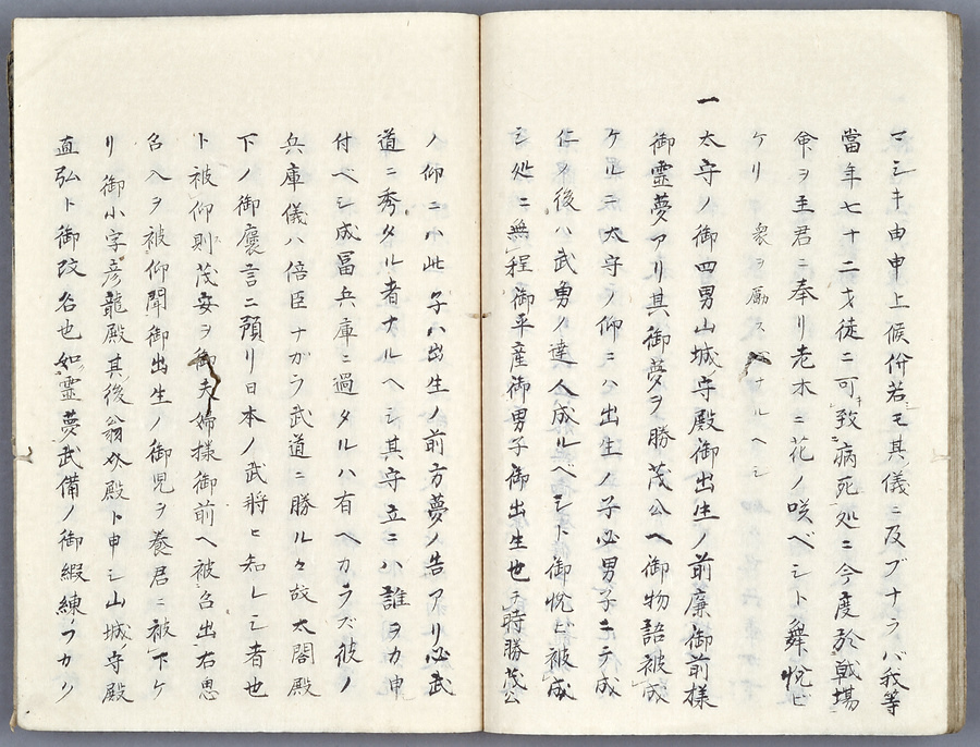 鍋島直弘(1618~61)は、元和4年(1618)初代佐賀藩主鍋島勝茂の四男として、正室・高源院との間に誕生した。その誕生前後の逸話が、佐賀藩士成富兵庫茂安の生涯について江戸時代後期に編纂されたとみられる本資料に載せられている。