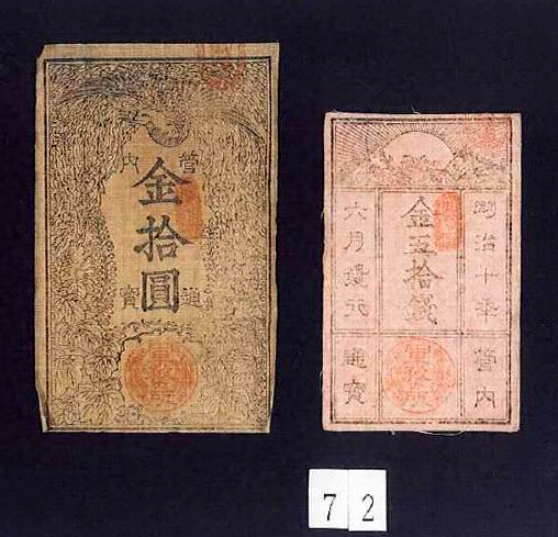 近世以前の貨幣で特筆されるのは,現存例の少ない桃山時代の天正大判である。判金の製作も極めて端正で,後藤徳乗(とくじょう)の墨書もよく残り,保存状態が極めて良好であるといえる。裏面には通用の痕跡を示す両替商の墨書も残され,学術的価値が高い。