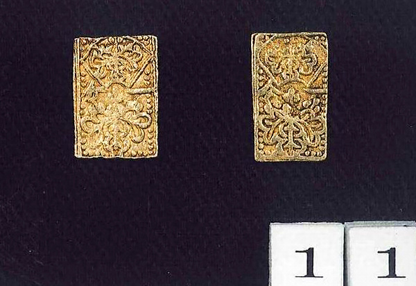 小判は,慶長・宝永・享保・元文・文政・天保・万延のものがあり,元禄・正徳・安政を除く江戸時代の小判の大部分がそろう。なかでも,文政小判は127枚,天保小判は112枚と多量に伝存するが,これらは,表面に変色がみられるのに対し,裏面は製造当時を彷彿とさせるほど良好な状態であることから,かつては包み金として伝存したものと考えられる。