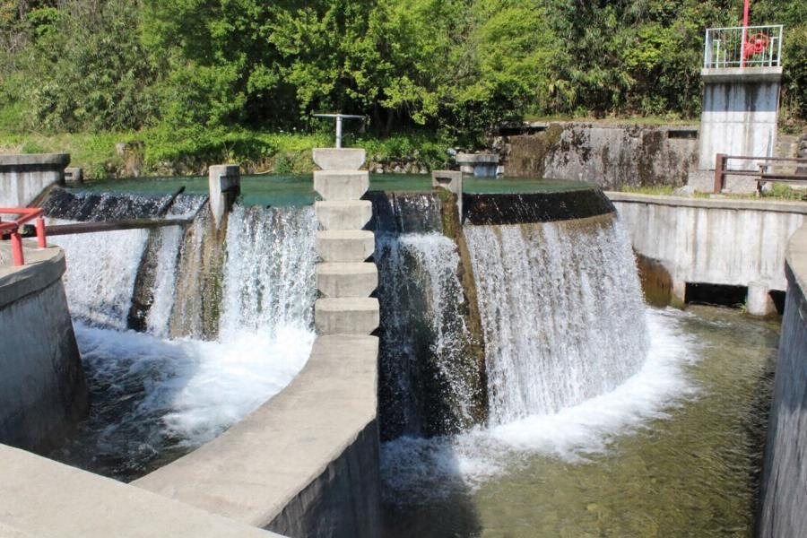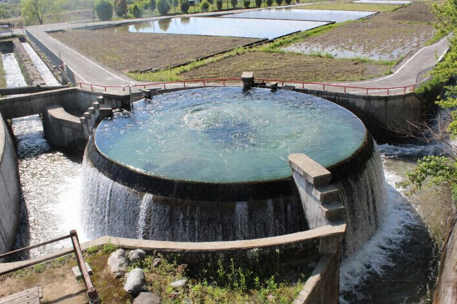 魚津市街地の東方、片貝川の扇央部に位置する。片貝川を横断するサイフォンの出口を兼ねる直径九・一メートルの円筒分水槽で、三つの用水へ分水する。片貝川沿岸用水合口事業の一環として建設されたもので、地域の水利システム近代化の歴史を物語る。