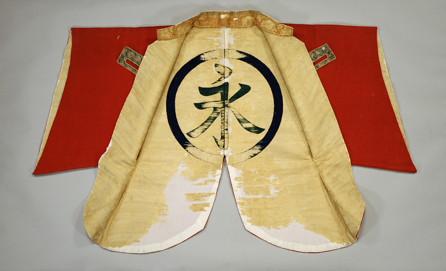 戦国の武将小早川秀秋(こばやかわひであき)所用といわれるもので、大胆な曲線裁断と、おおらかな模様が特徴的である。南蛮貿易で輸入された真っ赤な羅紗(らしゃ)を素材とし、切り嵌(ば)めにした鎌模様の一部はアップリケになっている。大胆な配色、奇抜なデザインは戦国武将のファッションの特徴である。(h21「戦う武士の世界」09)