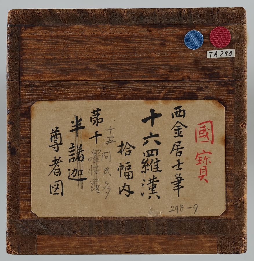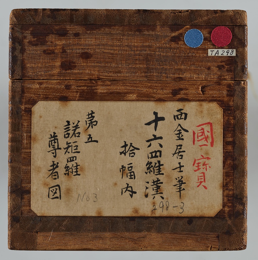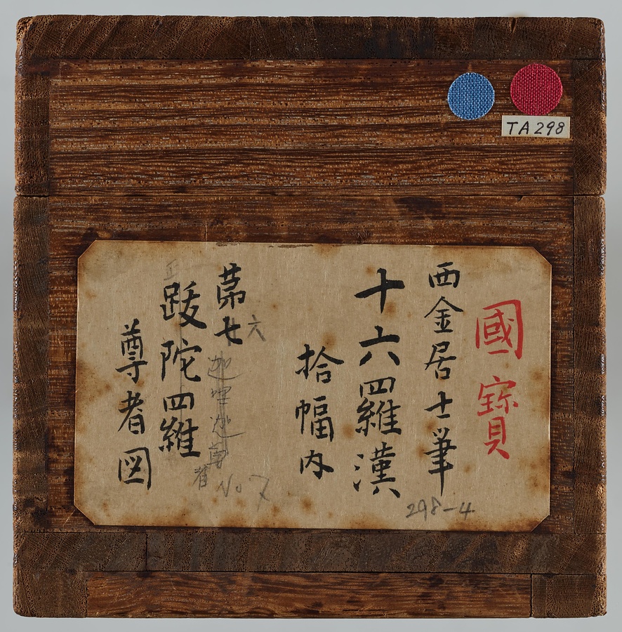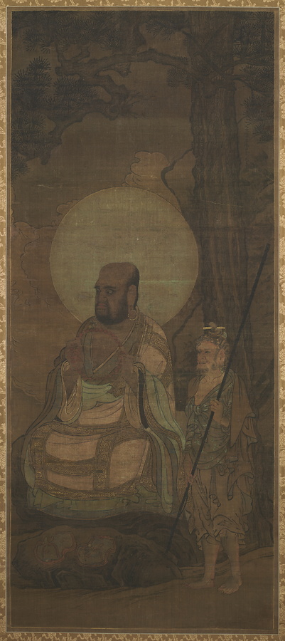 金大受(きんたいじゅ)は中国南宋の仏画師。浙江省(せっこうしょう)の寧波(ニンポー)で活動しました。寧波は日本の貿易船の寄港地であったため、寧波の仏画師の描く羅漢図は多く日本にもたらされました。羅漢達の風貌は比較的穏やかで、構図も整理されています。商品としても流通した寧波羅漢図の1遺例。