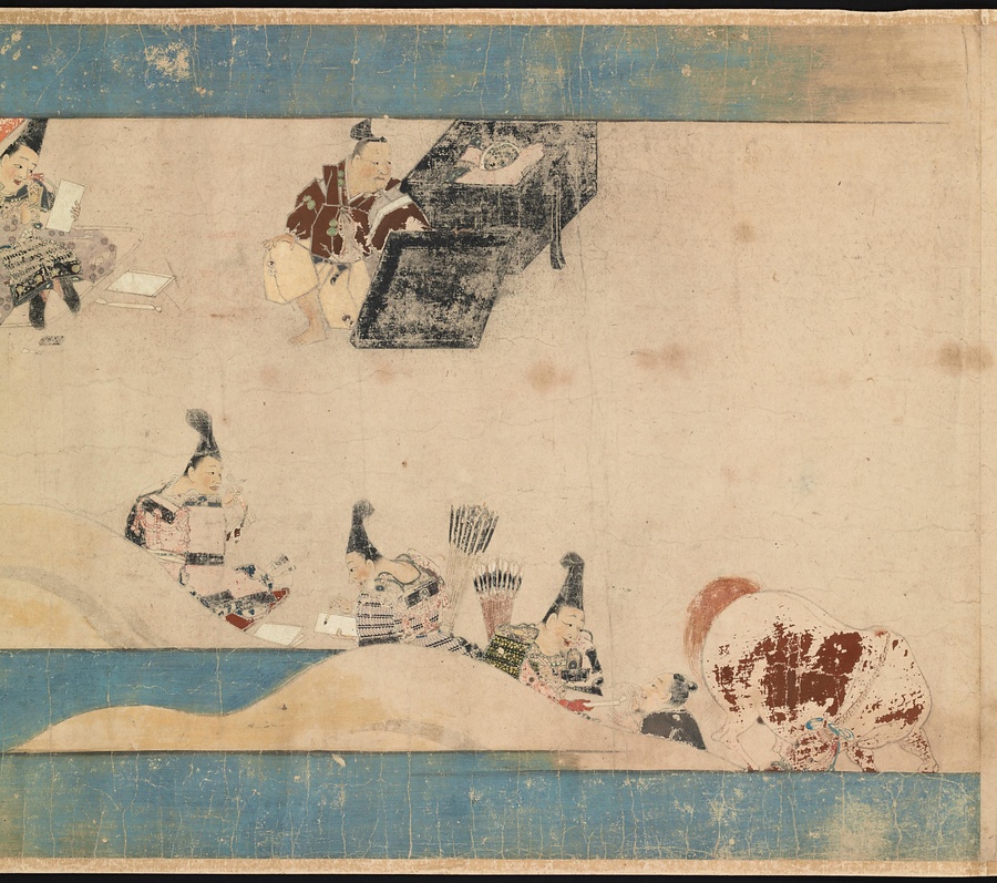 絵巻の筋書きは比叡山の僧、玄慧 (げんえ) が起草したこともわかっています。武士ではない人物の視点から描かれた合戦絵巻であるということを踏まえて見てみるのも、この絵巻の楽しみ方の一つかもしれません。
