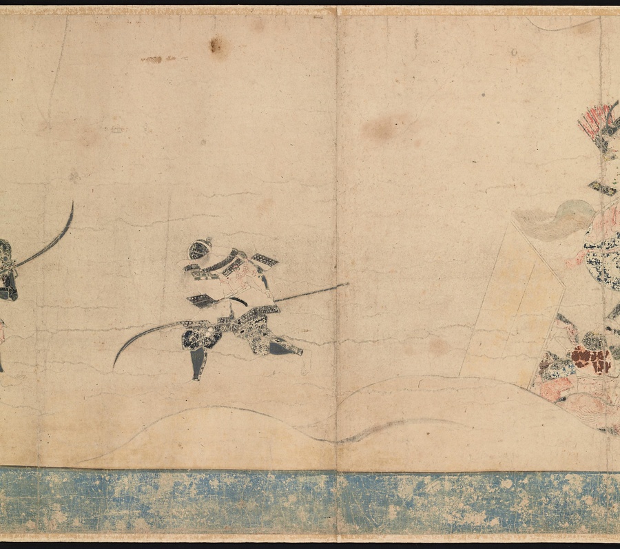 この絵巻の特徴は、何といってもサイズの大きさ。画面の天地が約45センチメートルもあり、絵巻の中でも大きい部類に入ります。画面が大きい分、人物も大きく描かれており、その表情まではっきりと見ることができます。また色使いにもご注目ください。明るい色使いで戦場の場面が軽快に描かれています。こういった色使いは南北朝時代に作られた絵巻に特有のものです。