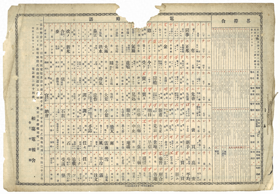 電信略語とは、電信(電報)を発信する際に必要な情報を、カタカナなどを用いて記号化したもの。米取引などに必要な情報(天候・生育状況等)が記されている。
