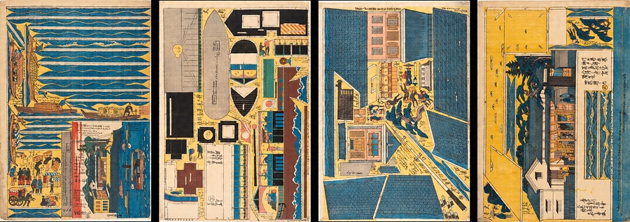 大新板 川口電信機神戸通り蒸気船浪花入津之体切組燈篭四枚続之内