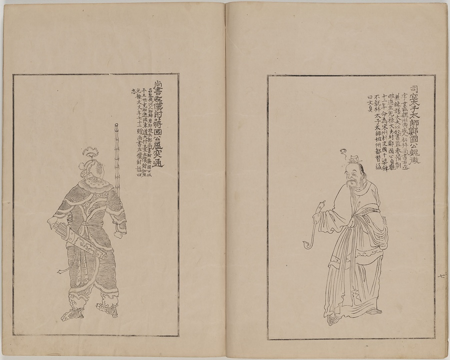 凌煙閣功臣図は、貞観17年(643)に唐太宗が閻立本に命じて宮中の凌煙閣に描かせた功臣24人の肖像壁画に由来する。本書は、康熙8年(1669)に蘇州で出版された劉源画『凌煙閣図』(紅葉山文庫旧蔵本・内閣文庫所蔵ほか)を、文化元年(1804)に谷文晁(1763~1840)が復刻した和刻本である。劉源本と比較すると、人物賛や観音大士、関羽像が省略され、功臣の順番も異なる。また、劉源本の蕭震、佟彭季、沈白、袁ホウ〔金+方〕4人の序文が市河寛斎の序文に差し替えられ、沈南蘋の跋文と文晁自身の識語が加えられている。南蘋の跋については日本における偽作とする説がある一方で、陳洪綬の功臣像画冊(個人蔵)にある南蘋の跋との関係が指摘されている。