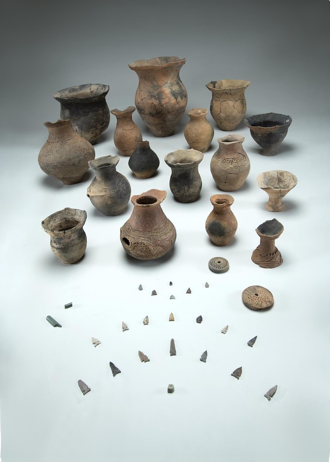 土器には、壺、甕、高坏、鉢などがあり、壺には注口や片口の付くものが含まれる。壺や甕は、筒形の頸部に波状や突起の付く口縁部をもつ例が目立ち、地文は縄文で、縦走・横走する例が多い。文様は刺突文を交互上下に入れて波状沈線様とする交互刺突文が特徴的で、他に連弧文や変形工字文などがあり、磨消縄文の手法も多くに用いられている。これらの内、波状や突起の付く口縁部、変形工字文や磨消縄文などは、縄文時代晩期の土器の特徴と似ており、そのために「天王山式土器」の年代について論争となったことは、学史的に著名である。現在、縦走・横走する地文の縄文は、北海道に分布する恵山式土器に影響を受けたものとされ、縄文時代的な要素は続縄文文化に系譜をもつと理解されている。
