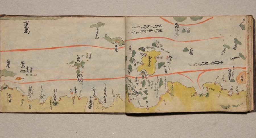 手書の海路図で、航路を朱線で記す。表紙に「平戸より大坂迄 懐中地図」と題箋に記された墨書があり、この外題を資料名とした。瀬戸内海の島々についての注記が特に詳細で、方角の記載は要所にあり、「懐中地図」の名のとおり、実用の海路図であったことをうかがわせる。