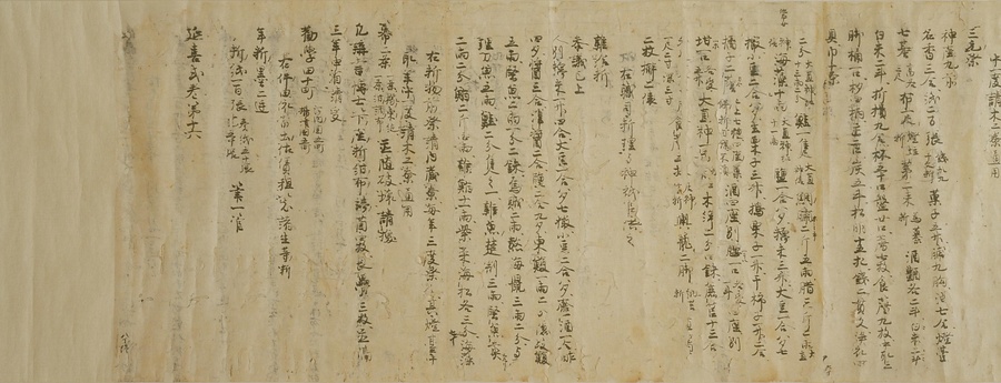 日本では7世紀の後半に、中国の例を学んだ法律が取り入れられました。それを律令(りつりょう)といいます。律は犯罪を罰する刑法、令はそれ以外の法律を指す言葉です。しかし、中国にならった律令は、日本の実情に合わない部分も多く、それを補うために出された法律を格(きゃく)といいます。そして、この律・令・格を実際に運用するうえで必要になる細かな規則を式と呼びます。平安時代において、この式は社会の変化に合わせてたびたび改められ、補われました。その中でも、延喜5 (905) 年に、醍醐(だいご)天皇の命令によって編集を開始したのが延喜式です。これ以前の式は一部しか残っていませんが、延喜式はほぼ完全な形で伝えられている点で重要な史料です。