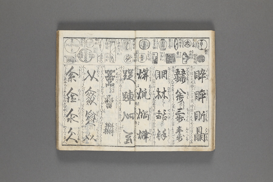 文化3年(1806)江戸日本橋上総屋忠助刊本。江戸後期の戯作者式亭三馬(1776-1822)撰の滑稽本で、寺子屋で使われた往来物『小野篁歌字盡』(35参照)のパロディ。外面的な形式は『小野篁歌字盡』を踏襲するが、訓や字義に駄じゃれやだまし絵などを取りこみ、滑稽な内容に仕立てている。