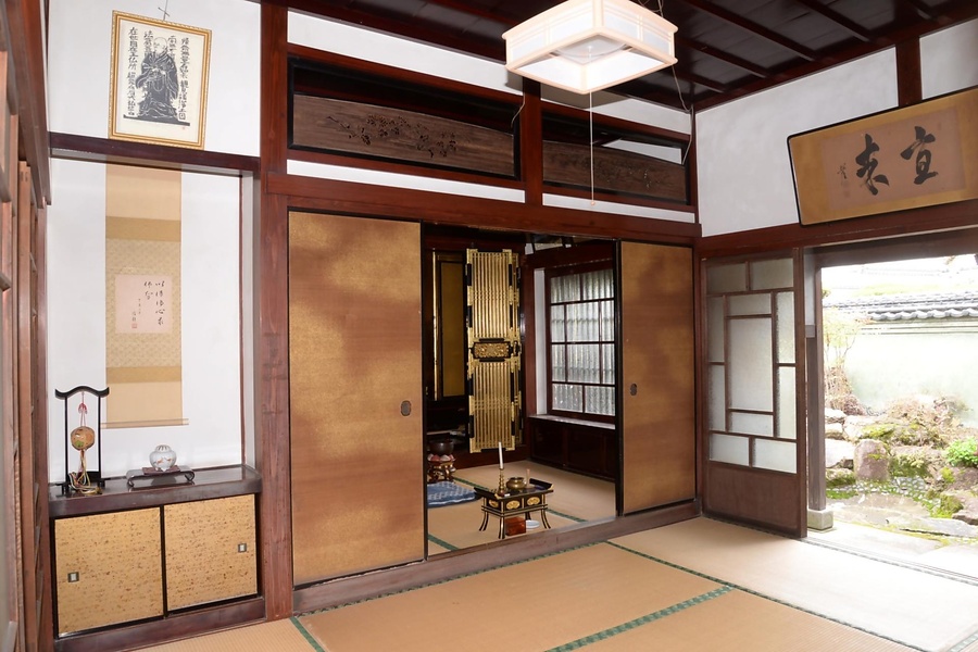 主屋北側に接続する仏間棟。切妻造平入桟瓦葺で、北面東寄りに寄棟造の式台玄関を付し、南西に便所棟を附属する。内部は東に6畳の仏間、西に3畳の拝所を上段に設け、西端は仏壇を配し障子を建てる。軸部や天井などを漆塗で丁寧に仕上げた漆商らしい仏間棟。