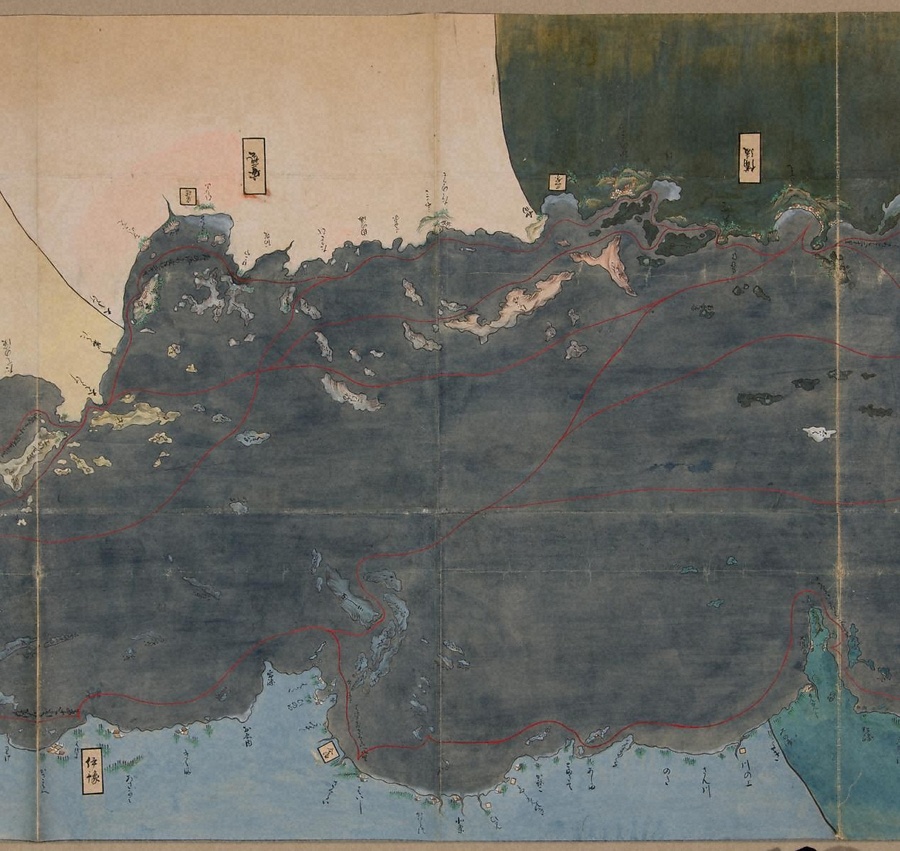本図は、大坂からの瀬戸内海航路と、そこからさらに鹿児島に至る九州沿岸の航路が描かれる。陸地の図形は大きくゆがめられる一方で、航路については詳細に描かれる点から、陸からの視点ではなく、海からの視点で描かれた実用的な航海図とみられる。現在は巻子装になっているが、本来は畳物であった。資料名は表紙の題箋から。