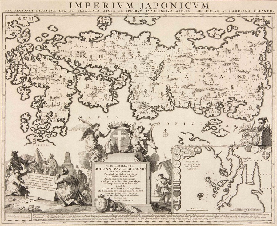 石川流宣の日本地図「日本海山潮陸図」(元禄4年〔1691〕、№260)を原図に採用したオランダ人東洋学者レランドによる日本図。当時日本国内で普及していた日本地図を入手し、それを日本の形として採用した。日本の図形は、地図としては、測量に基づいたそれまでの水準からは後退するが、地名は整理された。日本の旧国名を漢字で表記している。