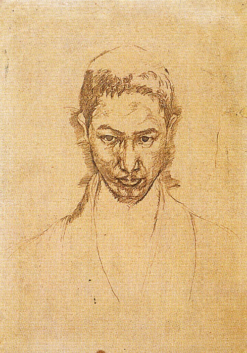関根正二は大正時代に活躍した夭折の画家です。わずか20歳と2か月で亡くなった彼の作品は所在不明のものが多く、現在確認されている作品はわずか100点ほどに過ぎません。その大半を占めるのはデッサンであり、硬質な線を刻み込むように描く独特の描法は、デューラーやレンブラントの図版を熱心に研究することで獲得されたものです。この『自画像』も関根の遺した優れたデッサンのひとつです。己れの顔を凝視し、自己の内面を徹底的に掘り下げることで、多感な17歳の青年の実像が見事に捉えられています。関根にとってデッサンが単なる下絵ではなく、一個の独立した作品であったことを雄弁に物語る作品といえます。