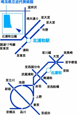 *JR京浜東北線北浦和駅西口より徒歩3分(北浦和公園内) *当館に専用駐車場はありません。提携駐車場「三井のリパーク 埼玉県立近代美術館東」では駐車料金の割引があります(企画展観覧で300円引き、MOMASコレクション観覧で100円引き)。 *団体バスは事前にご相談ください。 *お体の不自由な方のご来館には業務用駐車場を提供いたします。ただし、台数に限りがありますので、事前にご連絡をお願いします。