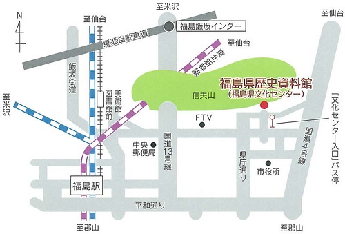 ●福島駅東口バス乗り場(9番)より市内循環バス(1・2コース)に乗車、『文化センター入口』停留所下車。徒歩5分。(運賃100円、本数は1時間に6~10本、乗車時間15分程度)
