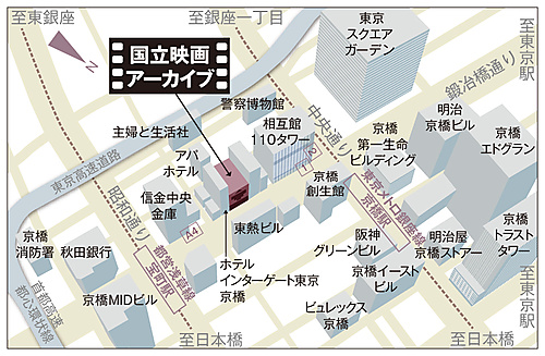 [住所]〒104-0031 東京都中央区京橋 3-7-6 [TEL]03-5777-8600(ハローダイヤル) ・東京メトロ銀座線京橋駅出口1から昭和通り方向へ徒歩1分 ・都営地下鉄浅草線宝町駅出口A4から中央通り方向へ徒歩1分 ・東京メトロ有楽町線銀座一丁目駅出口7より徒歩5分 ※2019年9月7日から11月頃まで改修工事のため出口7が閉鎖されます。期間中は、当館まで徒歩7分の出口9をご利用ください。 ・JR東京駅下車、八重洲南口より徒歩10分 ※駐車場・駐輪場はありません。公共交通機関をご利用ください。