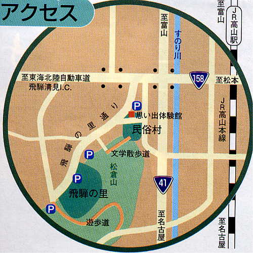 東海北陸自動車道清見インターを経由し、中部縦貫自動車道高山西インターから約20分