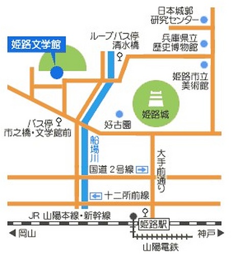 JR・山陽電車姫路駅より神姫バスターミナル9・10・17・18番のりb(一部止まらない系統があります。確認の上、ご乗車ください。)から乗車約6分、「市之橋・文学館前」下車北へ徒歩4分。 6番のりばで城周辺観光ループバス乗車10分。「清水橋(文学館前)」下車、西へ徒歩3分。