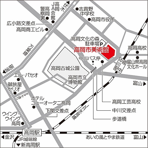 北陸新幹線新高岡駅より ●タクシー約10分 高岡駅より ●徒歩約20分(北東約2km) ●JR氷見線「越中中川駅」]下車、徒歩2分 ●万葉線「広小路」電停下車、徒歩10分 ●富山地鉄バス・富山駅前行「中川」下車、徒歩2分 自動車で ●能越自動車道 高岡北ICから約15分、高岡ICから約20分 ●北陸自動車道 小杉ICから約20分、高岡砺波スマートICから約20分 駐車場 [高岡市美術館地下駐車場]美術館開館日午前9時~午後6時、2時間まで駐車料金無料 [高岡文化の森駐車場(屋外)]駐車料金無料