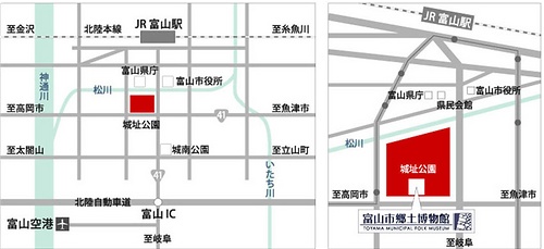 電車:JR富山駅より徒歩10分、車:北陸自動車道富山ICより富山市街方向へ15分、飛行機:富山空港より連絡バスで20分、最寄のバス停:「城址公園前」より徒歩2分 ※当館には専用駐車場はありません。城址公園地下駐車場(有料)をご利用ください。