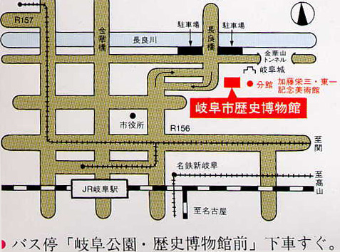「JR岐阜駅」、「名鉄岐阜駅」から岐阜バス長良川経由各方面行きにて約15分、「岐阜公園・歴史博物館前」下車すぐ