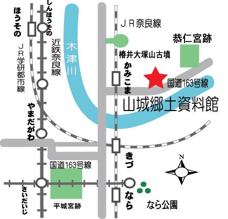 JR奈良線上狛駅下車徒歩20分、JR関西本線学研都市線木津駅下車タクシー10分